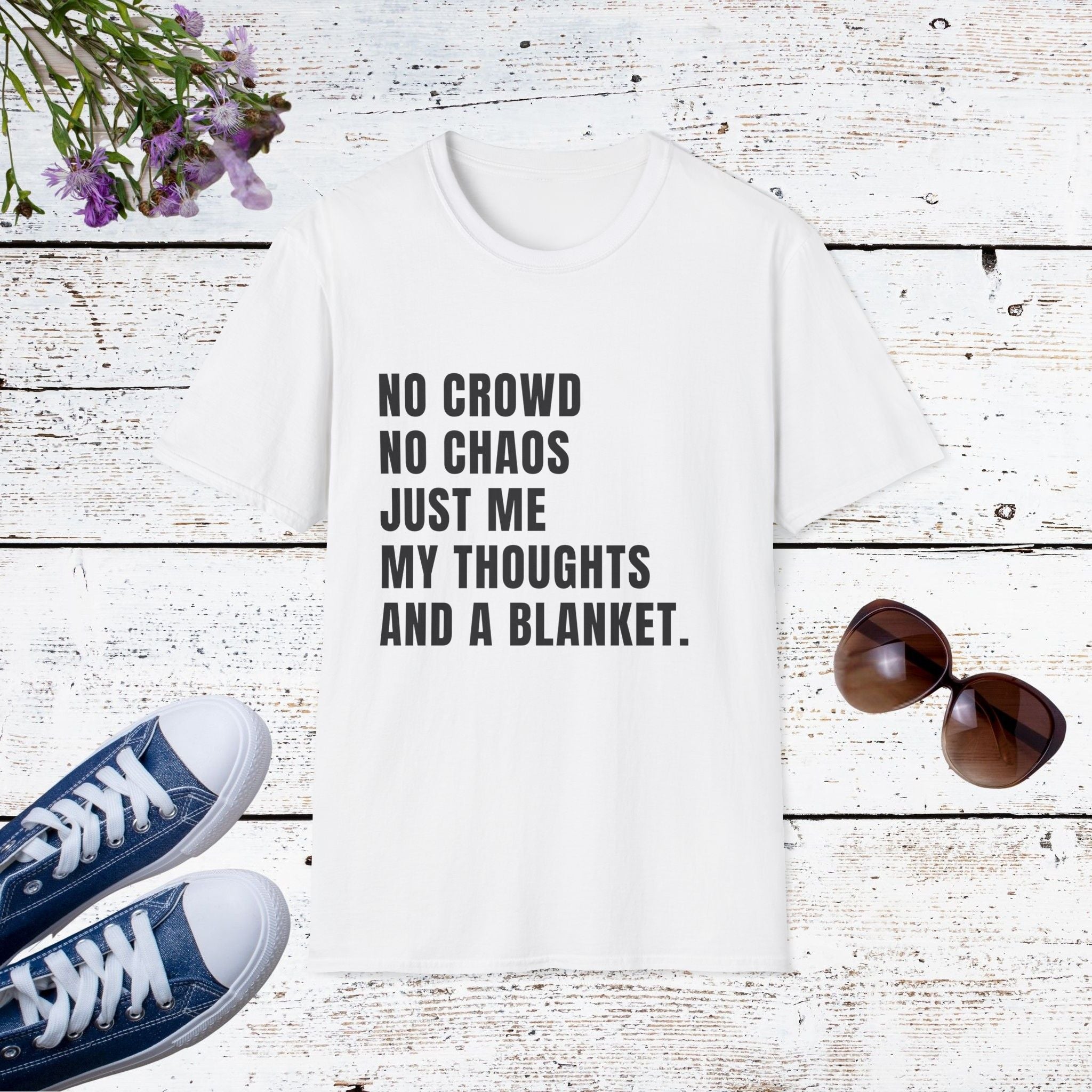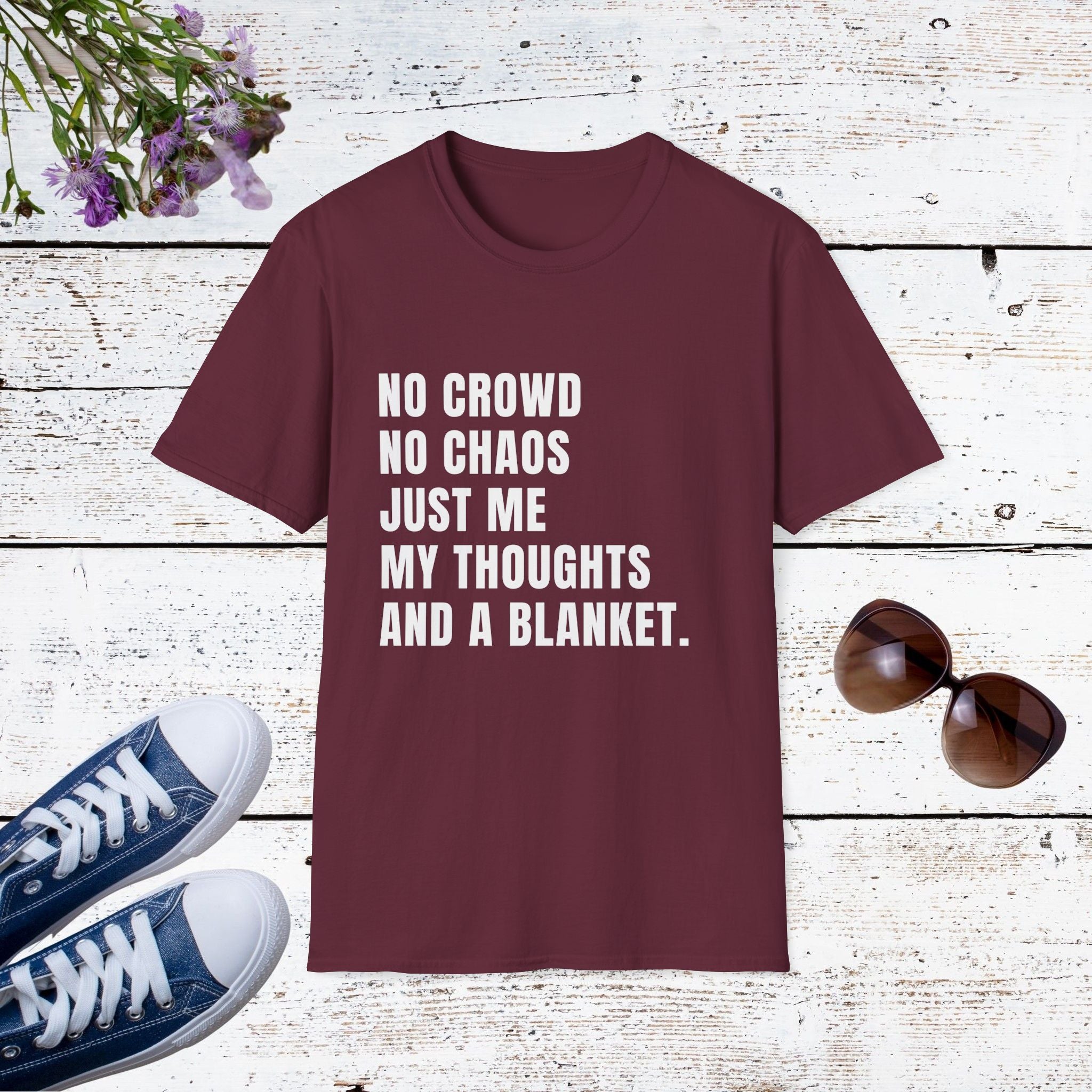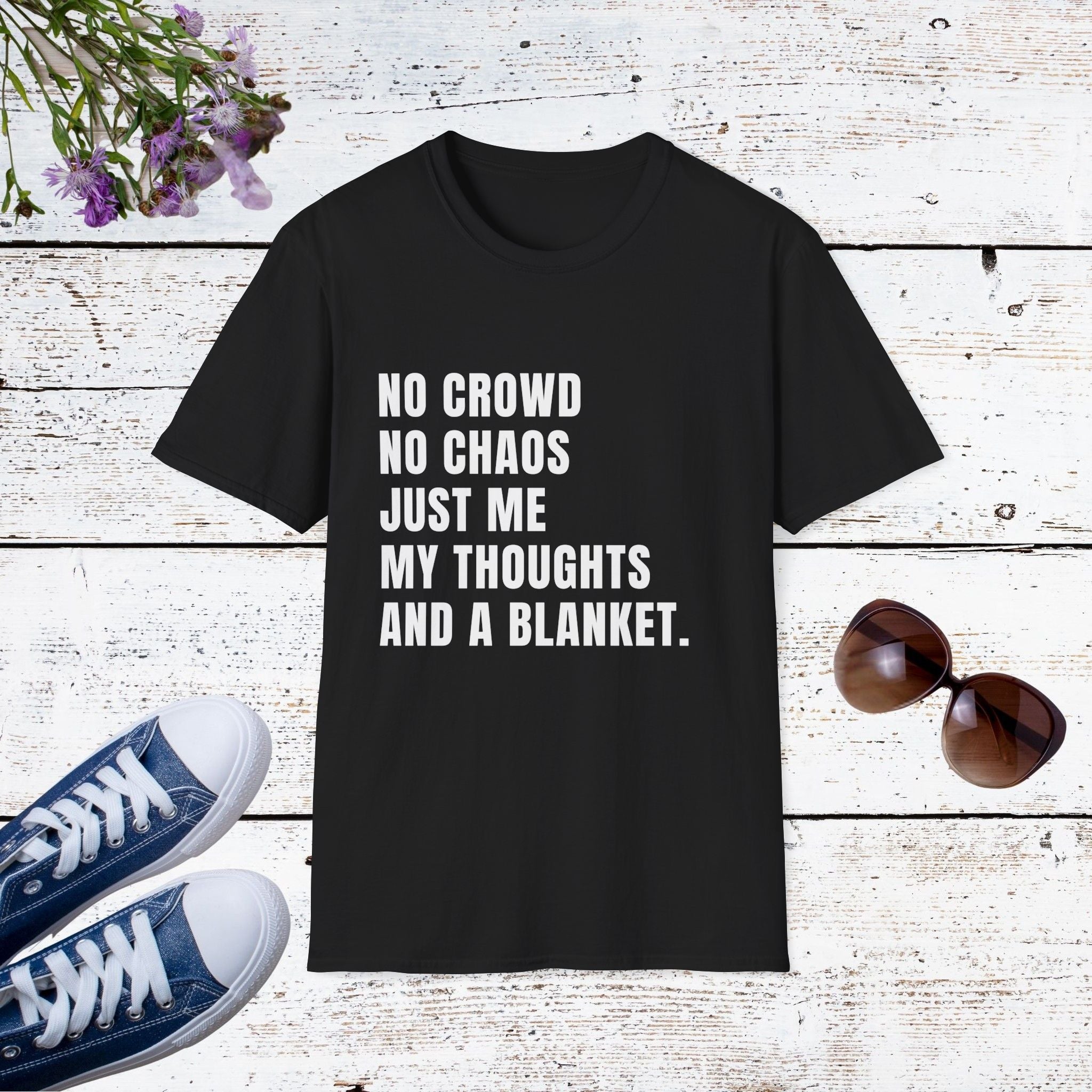 Peace, quiet, and a soft blanket - the ultimate mood. This “No Crowd. No Chaos. Just Me, My Thoughts, and a Blanket” tee is for everyone who recharges in solitude. Whether you’re curled up with Netflix, journaling, or just avoiding the noise of the world, this shirt is your cozy manifesto.